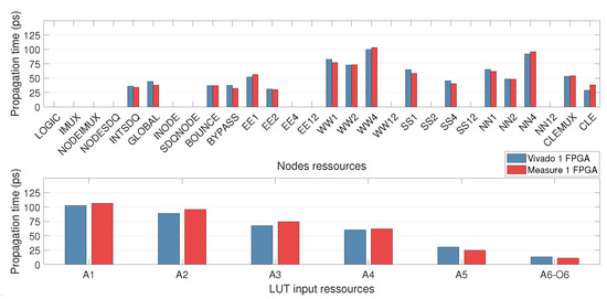 Because the propagation time reference given by Vivado depends on two parameters ( and ), it is ambiguous to determine the performance of the FPGA. For example, in Figure 5a, we can see that measurements are close to the reference (slowest FPGA considering the fastest internal components) but are also close to reference (fastest FPGA considering the slowest internal components). Therefore, we created two new references which consider intra-FPGA performance as the medium. Thanks to these two references, we know the performance state of our FPGAs considering intra-FPGA performance as the medium. These references are obtained with