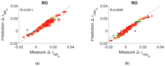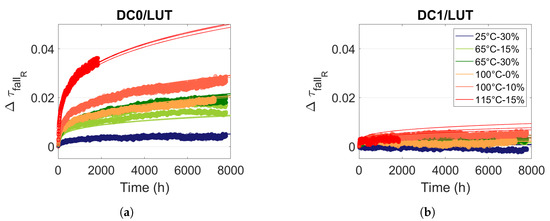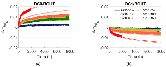 Comparison between measurement and prediction with model (20) of degradations in propagation time, at , for (a) falling and (b) rising edge in ROs for all static, dynamic, temperature and voltage stress conditions (different colours) and for all RO architectures.