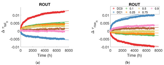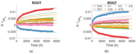 In order to extend the previous static model to dynamic stresses, we first attempt to model ageing directly from the static model. Because the method for modelling degradations in logical and routing resources for dynamic stress is the same, we only show the results for routing resources. Remember that (14) predicts the evolution of the edge propagation time F (rise or fall) for a static stress S (DC0 or DC1) in the routing resources. We consider that the degradation with dynamic stress corresponds to the sum of the degradations obtained with the static stresses DC0 and DC1 as a function of the time spent by the stress signal at the high and low levels, and therefore as a function of the duty cycle of the dynamic stress signal. Thus, the predicts the degradation of the edge propagation time F in the routing resources: