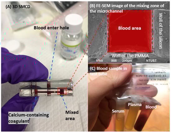 The 3D SMCD (sandwich structure—Poly(methyl methacrylate), PMMA/Silicon/PMMA) heterogeneous structure [] was fabricated using a low-temperature bonding technique. The 3D SMCD structure comprises a blood inlet and an outlet connected through the middle layer of the microchannel to facilitate the entry of blood into the mixing zone. Both the upper and lower layers had their own mixing zone. The blood mixing area was bonded to the lower layer of the 3D SMCD (Figure 1A,B). This helps prevent product breakage or blood leakage. A dedicated circulation and mixing system was developed for the microchannel device by integrating a 3D SMCD with a rapid withdrawal device. A micro-thin film pump was employed to drive the liquids, including the blood and coagulation factors, enabling the automatic transport of these substances for testing. This design ensured thorough mixing of any fluids within the microchannel device’s mixing zone, minimizing the potential for errors in blood test data interpretation due to human-operational factors.