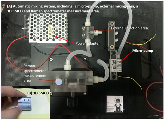 The automatic mixing system included a micropump, an external mixing area, a 3D SMCD, and a Raman spectrometer measurement area.