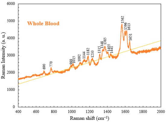 Raman spectroscopy can be applied in blood testing to determine the presence of certain diseases in individuals. There are distinct differences in the Raman characteristic peak positions and amplitudes between infected and uninfected blood samples. This makes Raman spectroscopy a valuable tool for rapid pathogen screening and identification. Reliable, rapid disease screening is necessary for the detection of emerging viruses, such as COVID-19, which will eventually overlap with the influenza virus infection []. Moreover, the acquisition of blood information through Raman spectroscopy has enabled the rapid and precise diagnosis of clinical diseases, such as liver disease, diabetes, cancer, allergies, genetic disorders, anemia, and leukemia [,,].