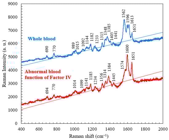 Raman spectra of whole blood without the coagulant and abnormal (Factor IV) blood with the coagulant obtained at RT.