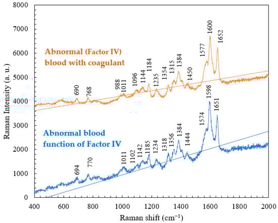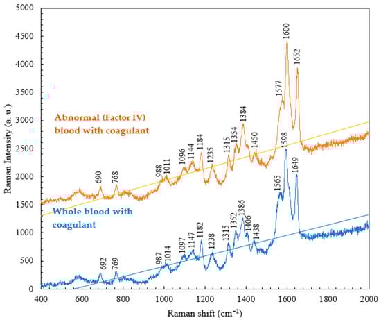 A comparative study of abnormal (Factor IV) blood with and without a coagulant was conducted. The results, as shown in Figure 7, indicate that the intrinsic pathway can be initiated by events that take place within the lumen of the blood vessels. The intrinsic pathway requires only the elements (i.e., coagulation factors, Ca++, platelet surface, etc.) found within or intrinsic to the vascular system. In the comparison between abnormal blood samples with and without the coagulant, the abnormal (Factor IV) blood with coagulant had lower intensities at the characteristic peaks of 770, 1011, 1185, 1318, 1356, and 1384 cm−1 and higher intensities at 988 and 1577 cm−1. This change in intensity, without a shift in the peak position, is attributed to a (significant) change in the clotting time of hemoglobin. The addition of the coagulant shortens the clotting time, and therefore, the abnormal (Factor IV) blood, which originally took a long time to clot, became fully coagulated. Table 3 presents the major Raman shifts and corresponding components of normal blood without the coagulant and abnormal (Factor IV) blood with the coagulant.