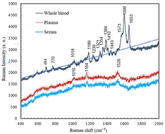 Raman spectra for whole blood, plasma, and serum obtained at RT.