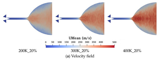 Figure 9 shows the distribution of the time-averaged velocity field and Mach number calculated up to 1 ms for wall temperatures of 200 K, 300 K, and 400 K at 20% needle valve opening ratio conditions. The Mach number is defined as , where , , , and represent the free-stream velocity, ratio of specific heat, gas constant, and temperature, respectively. The results show that the acceleration of nitrogen molecules occurs near the outlet of the microchannel. The velocity of the nitrogen molecules increases as the wall temperature increases. In contrast, the Mach number decreases gradually, which is due to the greater effect of temperature on the Mach number.