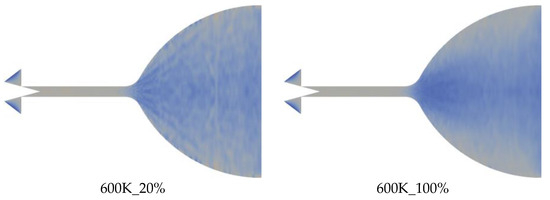 Figure 11 shows the distribution of the time-averaged temperature field calculated up to 1 ms for wall temperatures of 600 K, 700 K, and 800 K at 20% and 100% needle valve opening ratio conditions, respectively. The temperature is defined as , where is the equivalent molecular number of nitrogen molecular sample package; and are the total mass of gas molecules within the cell and the mean of their migration velocity; is the time-averaged number of DSMC particles within a cell; and is the Boltzmann constant (1.380649 × 10−23 J/K). The results show that the low-temperature region is distributed near the mid-axis of the nozzle expansion section, and the temperature is lower near the micro-channel section. This is due to the acceleration of gas molecules, which reduces the internal energy in the center of the nozzle expansion section. Compared with the time-averaged temperature field distribution at 100% opening, the temperature field distribution at 20% opening is more uniform, and the low-temperature region near the central axis is not apparent.