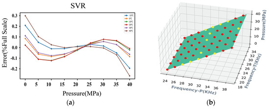 As Figure 8a shows, the preliminary measurements suggest that the fabricated resonant pressure sensor exhibits a strongly linear response when subjected to a constant temperature, demonstrating a sensitivity of 370 Hz/MPa at an ambient temperature of 40 °C. Considering 20 °C as the benchmark, Figure 8b exhibits the frequency drift caused by temperature changes at different constant pressure values. The graphs indicate that the frequency drift phenomenon is more pronounced at higher applied pressures. The output frequency exhibits a variation of 678 Hz upon exposure to a temperature between −10 and 40 °C, while ensuring a consistent applied pressure of 40 MPa. Given the estimated sensitivity of 370 Hz/MPa, the deviation of 678 Hz results in an approximate calibrated pressure error of 1.8 MPa, which significantly exceeds the normal margin of expected error. The introduction of nonlinearity into the pressure signal has caused serious issues for the sensor’s application; thus, it is necessary to compensate for the detrimental effect of nonlinearity caused by temperature by means of appropriate regression algorithms.