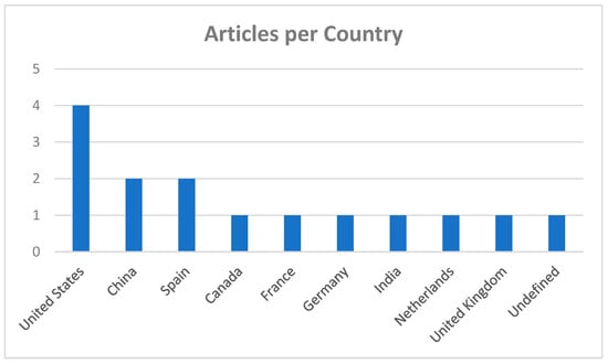 Figure 1. Relevant articles per country. The United States has a higher number of articles per country from the years 2018–2023 relating to control agglomeration.