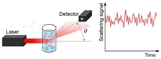 Figure 3. DLS principle of operation: laser light hits particles in suspension, and a high-time-resolution detector measures the intensity of the scattered light at a specific angle θ; scattered light intensity is due to particles’ Brownian motion fluctuating over time. Reproduced with permission from reference [].