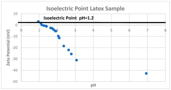 Zeta potential is the electrical potential developed at the solid–liquid interface [,,,,,,,] and depends on several factors []. Some factors depend on solvent parameters, such as pH, conductivity, temperature, presence, type, and concentration of ions. These parameters control particle mobility, including agglomeration, dispersion, coalescence, coagulation, and separation []. pH is one of the most critical elements in a solution [,] where the isoelectric point (IEP) is affected depending on the concentration of H+ and OH ions (Figure 6). Differences in the IEP in the same material indicate stability issues where the colloidal system is less stable. The electric double layer’s (EDL) thickness depends on the ion concentration and valency; a higher concentration compresses the double layer. Increased ionic concentration boosts conductivity but can decrease particle mobility; therefore, special care should be taken when choosing suspension parameters.
