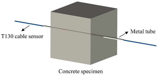 Furthermore, the authors used the method of tube insertion to embed T130 into the interior of the concrete, effectively avoiding the external force impact generated during the pouring and compacting of the concrete. Figure 2 shows the method of embedding T130 cable sensors into concrete specimens. The T130 cable sensor was taken and snapped into a metal conduit to prevent it from being damaged. We drilled through the holes reserved in the middle of both sides of the mold used for pouring concrete, ensuring that the sensor was at the center of the concrete specimen, and then the concrete mixture was poured into the mold. Subsequently, the metal conduit was pulled out of the mold after a dense vibrating process. In this way, the T130 cable sensor was effectively bonded to the concrete. The FBG had a more uniform stress distribution at the center of the concrete. Therefore, the authors embedded the FBG in the center of the cubic concrete specimen, to ensure that the strain changes measured by the FBG during the compressive strength test of the concrete specimens at different carbonation times were from the same position.