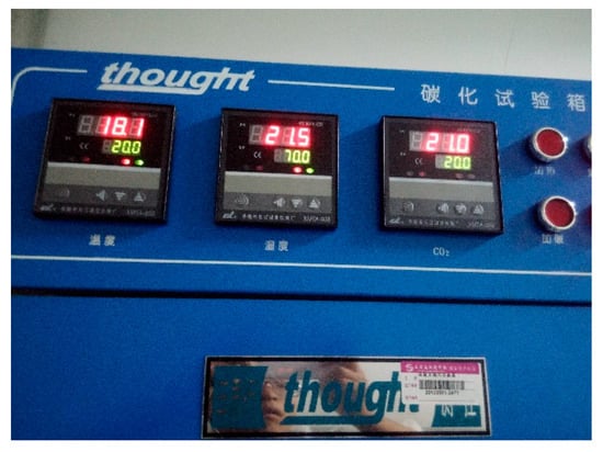 The concrete specimens were subjected to accelerated carbonation, based on the standard for test methods of long-term performance and durability of ordinary concrete (GB/T50082-2009) []. The specimens were removed from the curing room two days prior to testing and allowed to stand at a temperature of 60 °C for 48 h to dry, so as to prevent excessive initial moisture from preventing CO2 from entering the specimens and affecting the accuracy of carbonation depth measurement. After drying, the opposite side surfaces of the specimens were reserved, and the rest were sealed by applying epoxy resin. The centerline of the specimens was then drawn with a pencil along the length of the exposed surface, to facilitate the measurement of the carbonization depth. The sealed concrete specimens were positioned in the carbonation test chamber with a minimum distance of 50 mm between them to eliminate the error in carbonation depth resulting from uneven CO2 absorption. The carbonation test chamber for the concrete was the HTH-180, produced by Beijing Sansixing Measuring and Controlling Technology Co., Ltd. (Beijing, China) (see Figure 3). The conditions of carbonation are shown in Table 4.