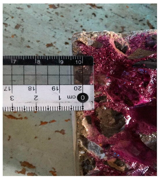 When the carbonation time reached 3 d, 7 d, 14 d, and 28 d, the specimens were taken out and split in the middle by a pressure machine. Subsequently, the authors cleaned up the remaining powder on the split surface and sprayed a solution of phenolphthalein with a concentration of 1%. At least six points were chosen to measure the carbonation depth after the surface became completely discolored and clear (See Figure 4). Following the GB/T50082-2009 standard [], three tests were conducted at each carbonation time and the arithmetic average of the carbonation depth obtained from these tests was considered to be the measurement value. If there were aggregate particles embedded exactly on the carbonation boundary line at the measuring point, the average value of the carbonation depth on both sides of the particle were taken as the depth value of that point.