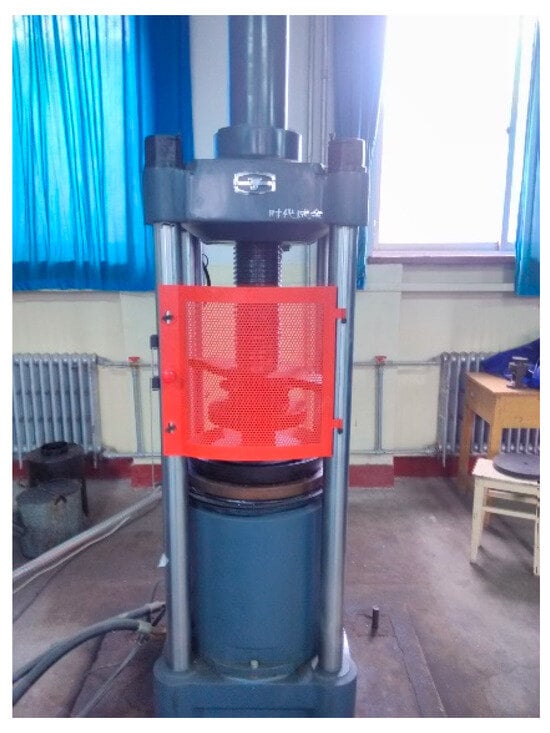The carbonized specimens were tested for compressive strength at the carbonation time of 3 d, 7 d, 14 d, and 28 d. Following the GB/T50081-2019 standard [], three tests were conducted at each carbonation time and the arithmetic average of compressive strength obtained from these tests was considered to be the test value. The digital display hydraulic pressure machine used is produced by TianShui HongShan Testing Machine Co., Ltd. (Tianshui, China) (See Figure 5). Its range is 0~2000 kN.