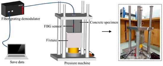 The specimen with the FBG sensor was placed on a specially designed pressure machine and the FBG sensor was connected to the SM130 FBG demodulator produced by Micron Optics, Inc. (Atlanta, GA, USA). The load capacity of the specialized press machine is 300 kN. The scan frequency and bandwidth of SM130 are 1000 Hz and 80 nm, respectively. The test diagram is shown in detail in Figure 6. A graded load (10 kN) was applied from 0 kN to 100 kN, ensuring that the ultimate load applied each time remained within the elastic deformation range of the concrete structure. As shown in Figure 6, the concrete specimen generated axial strain under external loads. The strain of concrete was transmitted to the FBG through shear stress, ultimately resulting in a FBG wavelength shift. If the FBG is positioned horizontally, it is insensitive to compressive stress. In this work, the compression test was undertaken in a controlled laboratory environment over a 10 min period. Accordingly, the temperature-induced FBG wavelength shift had no effect on the elastic modulus test in a short test time. Hence, FBG temperature compensation was unnecessary in this experiment.