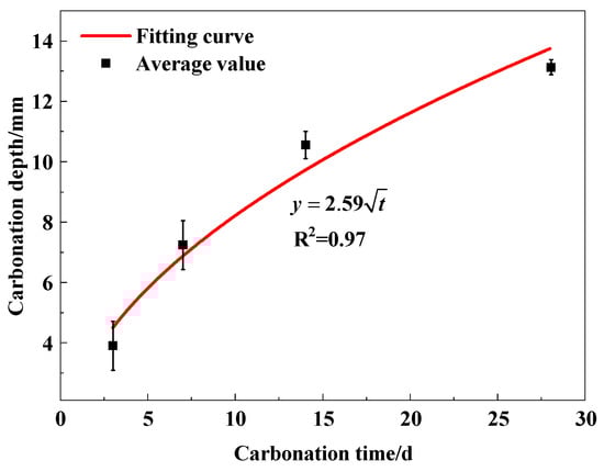 A mathematical model of carbonation depth (y) and carbonation time (t) is established based on Equation (3), as shown in Figure 7. The correlation coefficient is R2 = 0.97. Its fitting carbonation rate coefficient (α) is 2.59 in Figure 7.