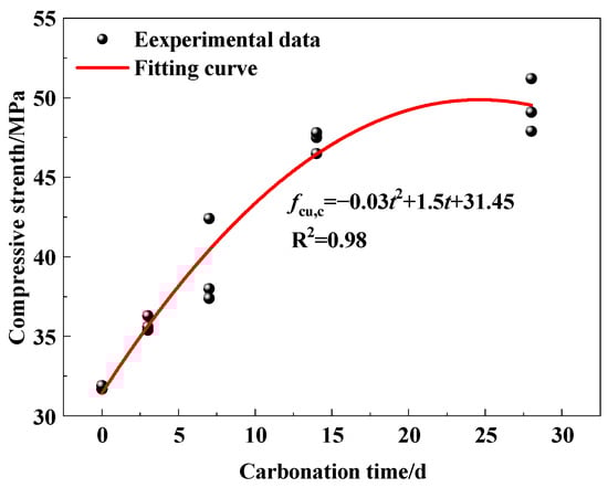 Figure 8 demonstrates the relationship between the compressive strength (fcu,c) of specimens and carbonation time (t). It is fitted as Equation (4). The correlation coefficient is R2 = 0.98. Thus, the compressive strength of concrete under carbonation shows a binomial relationship with the carbonation time, which is consistent with previous research [].