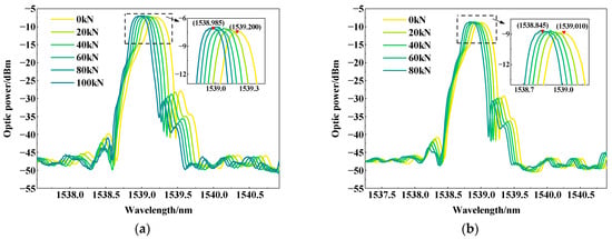FBG wavelength shifts of carbonized specimens under graded load: (a) the carbonation time of 7 d; (b) the carbonation time of 14 d.