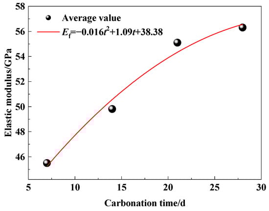 It can be seen that the elastic modulus versus carbonation time also exhibits a binomial relationship, which is consistent with the mathematical model of compressive strength with carbonation time. These results agree with the correlation of compressive strength–elastic modulus proposed by Yang [].