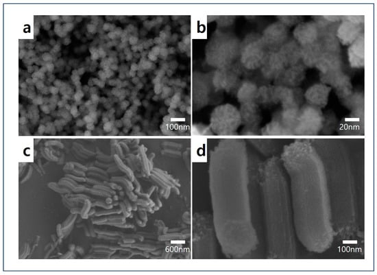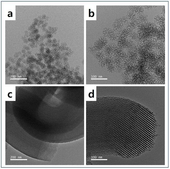 To confirm the structure and texture of DMS and SBA-15, the resulting images from SEM and TEM were used. Figure 2a,b show the successful synthesis of DMS with its unique pore texture, while Figure 3a,b demonstrate its hierarchical dendritic shape with a radial pore structure []. The rod-like particle and one-way cylindrical pore structure of SBA-15 were confirmed, as shown in Figure 2c,d and Figure 3c,d [,,]. Therefore, it can be assumed that DMS has various pore sizes and high pore accessibility, whereas SBA-15 appears to have a two-dimensional (2D) hexagonal pore structure, making it challenging for TEPA to access the center of the pores.