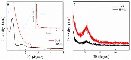XRD patterns of DMS and SBA-15: (a) low-angle XRD and (b) wide-angle XRD.