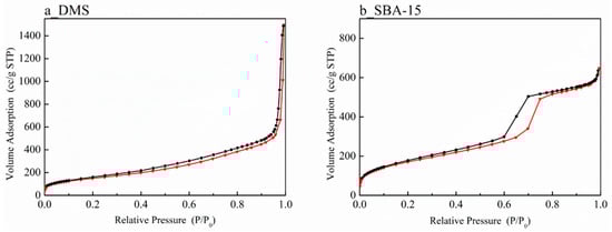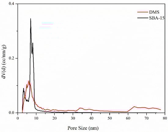 N2-physisorption isotherms and the pore size distribution of DMS and SBA-15 in Figure 5 and Figure 6 help to solve this issue. In the case of SBA-15 (Figure 5b), when accompanied by capillary condensation around the relative pressure range of 0.6–0.8 (P/P0), it exhibits a typical Type IV(a) characteristic according to the IUPAC classification, indicating cylindrical pores with a width wider than 4 nm. On the other hand, the isotherm of DMS (Figure 5a) looks like a mixture of Type II and IV with a broad pore size distribution area []. The part of the Type IV isotherm hysteresis loop indicates the presence of mesopores in a broad area. The isotherm of Type II suggests the possibility of the existence of macropores. Therefore, it can be assumed that DMS has pores ranging in size from meso to macro. Since the volume adsorption at the relative pressure of 0.3 (P/P0) of SBA-15 is larger than that of DMS, it is able to be estimated that SBA-15 has a slightly larger surface area. However, with a larger scale of the Y-axis, the wider area of the hysteresis loop indicates that the actual pore volume of DMS will be higher than that of SBA-15 [].