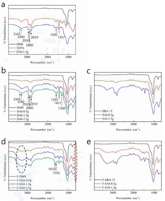 FT-IR spectra before and after TEPA impregnation and formaldehyde adsorption. (a) Pure substrate, TEPA, and DAI-0.5 g. (a–c) N–H bending (1595 cm−1), C–H bending (1457 cm−1), C–H stretching (2810 cm−1, 2880 cm−1, and 2930 cm−1) and N–H stretching (3280 cm−1 and 3345 cm−1) peaks of the impregnated TEPA in DMS and SBA-15 are shown. (d,e) N–H wagging (under 750 cm−1), C=N stretching (1650 cm−1), and broad O-H stretching (3280 cm−1 centered) peaks.