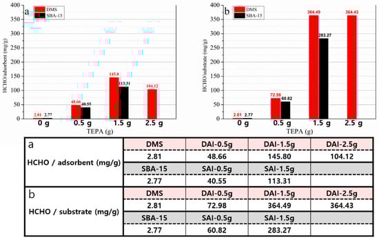 As more TEPA was impregnated, the adsorption of formaldehyde per weight of the amine-impregnated adsorbent increased. However, in DAI-2.5 g, when 2.5 g of TEPA was introduced, the amount of formaldehyde adsorbed decreased. The amount of adsorbed formaldehyde per weight of substrate did not decrease but also did not increase. Compared to SAI, DAI adsorbed more formaldehyde at every point with the same amount of impregnated TEPA, and this was the same both per substrate and per whole adsorbent. This result is consistent with other research, suggesting that the pores of the substrate can become blocked when TEPA is impregnated into the pores. As TEPA fills the pores, the difference in the pore size and pore volume of the substrate results in varied pore availability, as expected [,,].