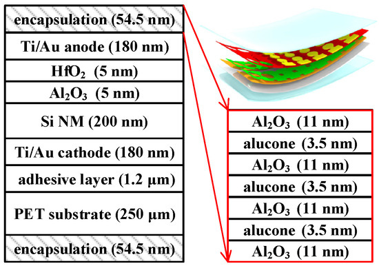 In this work, we generated 3.5 dyads of Al2O3/alucone (11 nm/3.5 nm) on Si NM-based MOSCAPs using ALD/MLD. The electrical properties of encapsulated and unencapsulated MOSCAPs under bending strains were comprehensively analyzed to demonstrate the improved electrical stability of encapsulated MOSCAPs. The device fabrication and encapsulation methods are described in Section 2. Capacitance versus voltage (C–V) and current density versus voltage (J–V) curves of the MOSCAPs in the flat state were obtained (Section 3) to investigate the effects of bending strains on electrical properties (Section 4). Critical parameters that reflect the stability of the dielectric layer and interface at dielectric/Si NM, namely the maximum capacitance (Cmax), minimum capacitance (Cmin), gate leakage current density (Jg), and hysteresis voltage (Vhy) of capacitors with and without encapsulation were further analyzed. In addition, the effective oxide charge (Neff), oxide trapped charge (Not), interface trap density (Dit), and frequency dispersion (Freq. (ω)) were analyzed to determine the effectiveness of the deposited ultrathin encapsulation structure. The results indicated that Al2O3/alucone nanolaminates improved the mechanical strain insensitivity of MOSCAPs without affecting the original electrical characteristics.