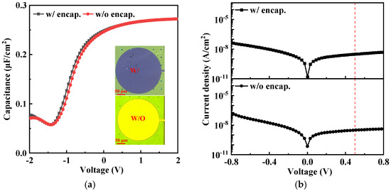 Figure 3. (a) C–V and (b) J–V curves of MOSCAPs with and without Al2O3/alucone encapsulation in the flat state. Insets: microscopic images of the top gate for MOSCAPs with and without encapsulation. Scale bar: 50 μm.