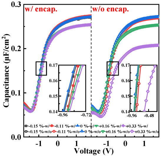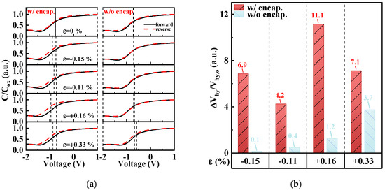 Figure 7a shows the normalized capacitance versus voltage curves of unencapsulated and encapsulated MOSCAPs in the unbent and four bent states, which were obtained by sweeping in the forward and reverse directions. Figure 7b shows the changes in Vhy at different bending strains divided by Vhy in the unbent state (ΔVhy/Vhy,o). The results showed that the Vhy of the encapsulated MOSCAP significantly increased as the strain increased. We inferred that high-energy ion bombardment during the ALD/MLD process generates mobile ions in the Al2O3/alucone encapsulated MOSCAP, leading to a larger and counterclockwise fluctuating Vhy under bending strains compared with that of the unencapsulated MOSCAP. However, the Vhy values of the two types of MOSCAPs were small, both of which were 0.02 V, indicating that the gate electrode of the encapsulated MOSCAP in the pristine shielded this effect. The results of Not mentioned below verified this inference. Nevertheless, this instability can be eliminated through annealing, as demonstrated for other ultrathin channel-based thin-film transistors (TFTs) [24]. On the other hand, the investigation focuses on the relative change. The possible pre-existing defects in the oxide layer are included as the baseline for encapsulated and unencapsulated MOSCAPs at the original state. Thus, the Vhy-related changes are more likely to be defined as process-related defects, gradually influencing the Vhy at compressive and tensile strains.