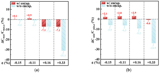 Figure 5. Changes in the (a) maximum capacitance (ΔCmax/Cmax,o) and (b) minimum capacitance (ΔCmin/Cmin,o) at different inward and outward bending strains.