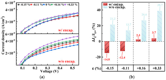 Figure 6. (a) Current density versus voltage curves at different bending strains. (b) Changes in the gate leakage current density (ΔJg/Jg,o) at different inward and outward bending strains.