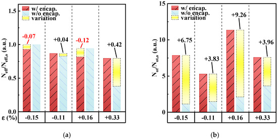Figure 8. (a) Effective oxide charge (Neff/Neff,o) and (b) oxide trapped charge (Not/Not,o) at various bending strains.