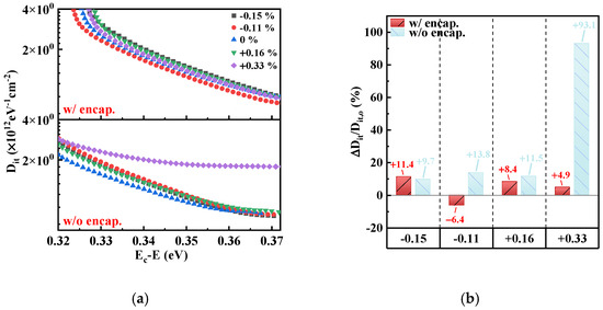 where Vfb_theor. is the theoretical flatband voltage, q is the electron charge, and A is the active area of MOSCAPs. The results showed that the Neff of the encapsulated MOSCAP was stable and changed by up to 12% under bending strains, leading to a slight negative shift in Vfb. At the high tensile stain of +0.33%, the Neff of the unencapsulated MOSCAP was smaller than that of the encapsulated MOSCAP by 42% (Figure 8a, yellow bar), which was attributed to the decreased Cmax of the unencapsulated MOSCAP. These results indicated that without encapsulation, the interface between the oxide and ultrathin Si channel was unstable. The Not values of the encapsulated and unencapsulated MOSCAPs in the unbent state were 0.33 × 1011 cm−2 and 0.32 × 1011 cm−2, respectively. However, these values (representing the abundant oxide trapped charges near the interface of the oxide and ultrathin Si channel) changed as the bending strain changed, which increased the Vhy of the encapsulated MOSCAP under strain. This trend highlighted the necessity to monitor the chamber while depositing multilayers on flexible oxide-based TFTs.