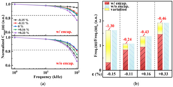 Figure 10. (a). Normalized Cmax versus frequency curves at different bending strains. (b) Frequency dispersion normalized by Freq.(ω)o (Freq.(ω)/Freq.(ω)o) at different bending strains.