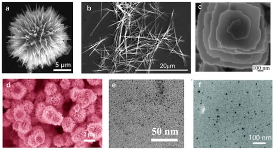 Xiao et al. [] reported for the first time a method for fabricating hierarchical flower-like WO3 nanostructures constructed from needle-like single-crystalline nanosheets. By mixing tungstate powder with K2SO4 and subsequently acidifying the mixture using an HCl solution, a stable flower-like WO3 composed of relatively loosely packed nanosheets and with a diameter of 16 μm was obtained, as shown in Figure 1a. This hierarchical structure exhibits promising potential for sensor applications. To fabricate α-MoO3 nanoribbons, Kwak et al. [] used molybdenum metal powder sealed in the autoclave after hydrogen peroxide treatment as a precursor, leading to nanoribbons with a thickness of approximately 10–12 nm and a lateral dimension of ∼200 nm, with morphology depicted in Figure 1b. Numerous prior studies have employed the hydrothermal method for the synthesis of MoO3, yielding distinct morphologies. For instance, Li et al. [] successfully produced MoO3 with various shapes, including helical nanosheets, crosslike nanoflowers, and nanobelts, utilizing an environmentally sustainable chemical route on a large scale. Metallic molybdenum powder was used as a precursor, mixed with distilled water and hydrogen peroxide, and then transferred to an autoclave for a hydrothermal process at 180 °C for 2 to 12 h. Interestingly, some nanosheets tend to be twisted to form helical structures, as shown in Figure 1c. Different morphologies, ranging from helical nanosheets and crosslike nanoflowers to nanobelts, have been observed in various studies using the hydrothermal technique, demonstrating the flexibility of the hydrothermal method for fabricating TMOs.