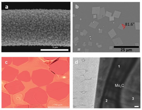 Optical images of TMCs and TMOs fabricated via thermal CVD. SEM images of (a) WO3 deposited on GCW (reproduced with permission from Ref. []. Copyright 2020, Elsevier), (b) MoO3 nanosheets (reproduced with permission from Ref. []. Copyright 2020, Elsevier), (c) ultrathin α-Mo2C crystals on a Cu/Mo substrate (reproduced with permission from Ref. []. Copyright 2020, IOP Science), (d) TEM image of the Mo2C on graphene film (reproduced with permission from Ref. []. Copyright 2017, Wiley).