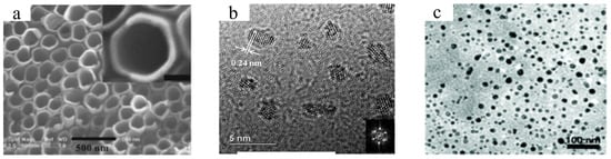 While hydrothermal and CVD methods have been popularly adopted for the synthesis of TMOs and TMCs, a number of alternative fabrication techniques have emerged. In a research study by Hu and his team [], TiO2/Au was fabricated by rapidly annealing anodized TiO2 nanotubes in argon and then electrodepositing Au nanoparticles. The morphology of as-prepared TiO2/Au is shown in Figure 3a. The C-doped TiO2 electrode was created by electrochemically anodizing titanium foil in an NH4F–ethylene glycol combination. After the anodization, the remaining ethylene glycol was used as a carbon source during argon annealing at 500 °C. Chekin et al. [] presented a green approach for the synthesis of pure cobalt oxide (CoO) nanoparticles using gelatin in an aqueous medium. Cobalt nitrate was dissolved in deionized water and was mixed with gelatin before being agitated at 80 °C for 12 h to make resin. After cooling, it was treated in a furnace at 500 °C for 8 h, producing 25-nm CoO nanoparticles that are attractive for biological sensing applications due to their size and characteristics.