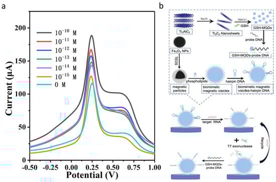 (a) DPV response of the MoS2/Ti3C2 at different concentrations of miRNA–182 (reproduced with permission from Ref. [], copyright 2019, Elsevier), (b) schematic of fabrication procedure of an electrochemical sensing system based on MQDs and biomimic magnetics vesicles (reproduced with permission from Ref. [], copyright 2022, Elsevier).