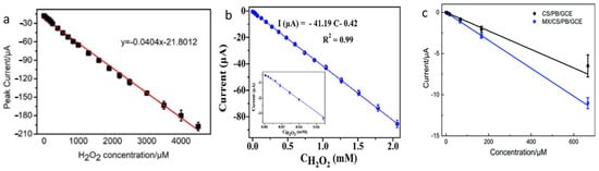 Calibration curves from amperometric response of (a) Mo2C/NC nanocomposite in the presence of 0.01 M phosphate buffer (reproduced with permission from Ref. [], copyright 2019, Wiley), (b) Mo2C/Mo3P (reproduced with permission from ref. [] copyright 2022, Elsevier), (c) the CS/PB/GCE (black) and MX/CS/PB/GCE (blue) in the 0.1 M phosphate buffer (pH 6.0) at an applied potential of 0 V (vs. Ag/AgCl) (reproduced with permission from Ref. [], copyright 2021, Royal Society of Chemistry).