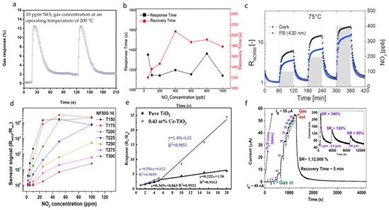 (a) Transient gas response curves of MoO3 film for two successive cycles of 10 ppm NO2 gas concentration at an operating temperature of 200 °C (reproduced with permission from Ref. [], copyright 2017, Elsevier), (b) response and recovery time of the α-MoO3 sensors toward NO2 from 50 to 1000 ppb at 125 °C (reproduced with permission from Ref. [], copyright 2022, Elsevier), (c) dynamic normalized responses of WO3 nanofibers to NO2 gas in dark conditions (black line) and purple blue light (blue line) at 25 °C (reproduced with permission from Ref. [], copyright 2016, Elsevier), (d) WO3 nanofibers sensor signal as a function of NO2 concentrations at operating temperatures ranging from 150 to 300 °C (reproduced with permission from Ref. [], copyright 2021, Elsevier), (e) relationship of responses values of Ce-TiO2 nanocrystal versus NH3 concentration (reproduced with permission from Ref. [], copyright 2022, Elsevier), (f) response curve of nanocrystalline TiO2 thin film on the Si/SiO2 substrate (reproduced with permission from Ref. [] copyright 2021, Elsevier).