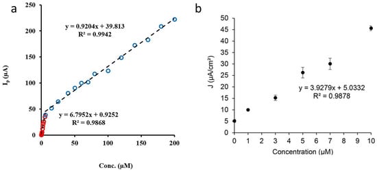 The calibration curve of (a) Fe3O4@PPy in a Britton Robinson solution (pH = 8) for MET detection (reproduced with permission from ref. [], copyright 2021, Elsevier). (b) DPV measurements of dopamine from 0 to 10 μM via GO/Fe3O4 electrode (reproduced with permission from Ref. [], copyright 2022, Taylor and Francis).