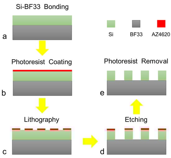 Figure 1. Fabrication process of the biosensor. (a) Bonding the silicon wafer and BF33 glass, (b) coating the photoresist AZ4620, (c) lithography and developing, (d) etching the double-gap ring column array, (e) removing the photoresist.