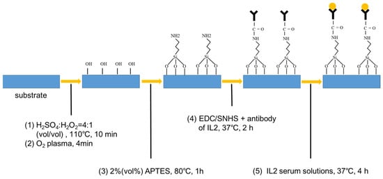 To improve the sensitivity and specific detection of IL-2 (Sangon Biotech, Shanghai, China), the surface of the biosensors should be functionalized by surface modification [], as depicted in Figure 2.