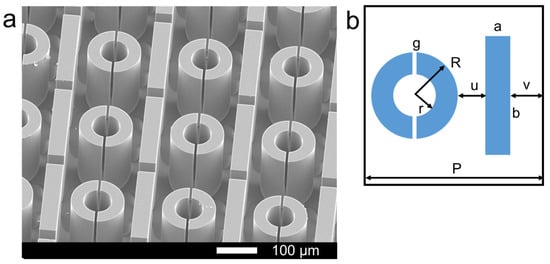 The microstructure of the device is shown in Figure 3. The SEM image of the biosensor is shown in Figure 3a, and the size of the unit cell is shown in Figure 3b, in which a = 50 μm, b = 240 μm, g = 8 μm, R = 75 μm, r = 37 μm, u = 24 μm, v = 27 μm, P = 250 μm.