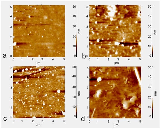 Figure 4. AFM image at different functionalization steps. (a) The surface of the substrate, (b) after oxygen plasma treatment, (c) after reaction with APTES and coupling agent solution, (d) modification of IL-2 antibody.