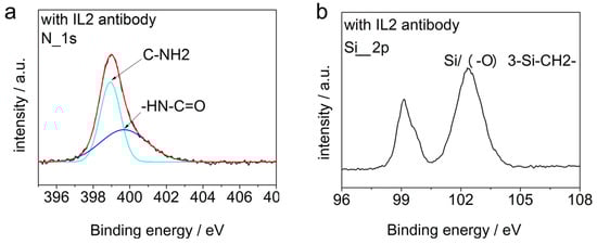 Figure 5. XPS spectra analysis for the modified device. (a) The N1s peak of the sample modified by the IL-2 antibody and the results of its split-peak fitting, (b) the Si2p peak of the sample modified by the IL-2 antibody.