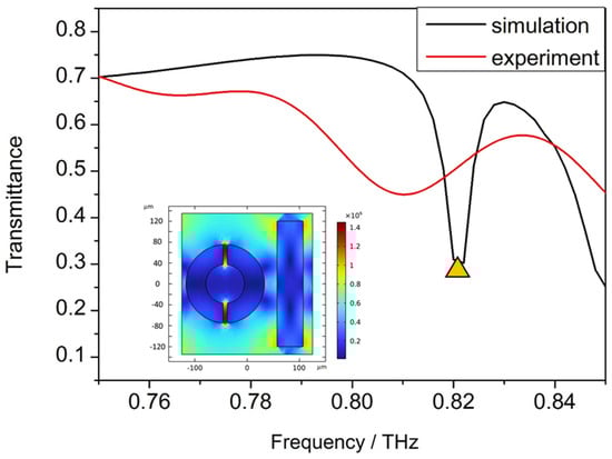 Figure 6. Simulated and experimental transmission spectrum of the device, the distributions of the electric fields at 0.82 THz marked by yellow triangle shown in the insert.